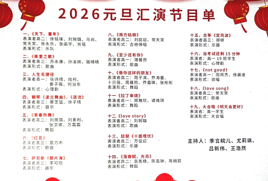 本次汇演节目形式多样、内容丰富多彩,涵盖歌曲、舞蹈、乐器演奏、心理剧、说唱、合唱等多种艺术形式,充分展现了我校学子多才多艺、全面发展的精神风貌。由季言皖儿、尤莉娴、吕新伟、王浩然四位同学担任主持人,他们台风稳健、串联流畅,为整场活动增添了不少色彩。