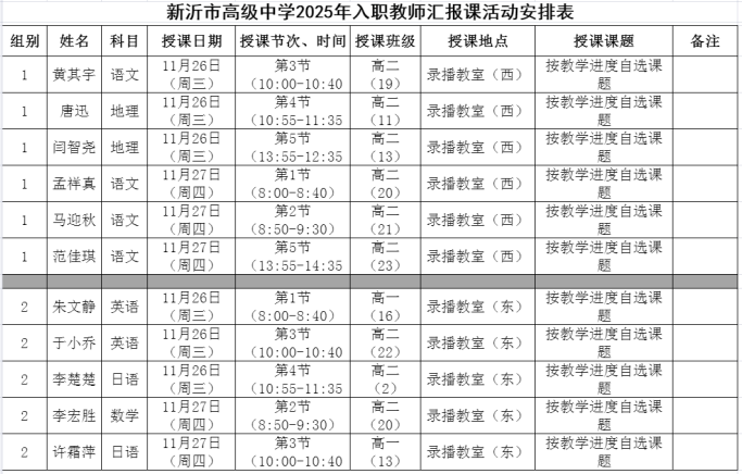 为检验“青蓝工程”实施成效,夯实新教师教学基本功,促进青年教师专业成长,11月26日至27日,新沂市高级中学2025年新入职教师汇报课活动在东西录播教室顺利开展。学校教科室统筹组织,各学科教研组全程参与,12位新入职教师依次登台,完成教学能力阶段性成果展示。